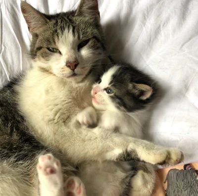 George is a survivor of the Australian bushfires. She came to us still covered in ash and very frightened. Unfortunately, like so many other animals, it’s suspected that 3 of her 4 kittens perished in the fire as they couldn't be found 😞 Amazingly, George played surrogate mum to another kitten that wasn't her's after the fires as that kitten had lost its family. George is so maternal, she took it in easily, breastfed and cared for it.